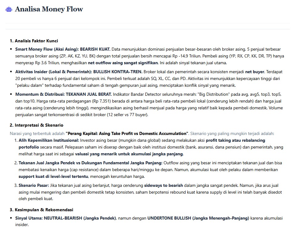 Terjemahkan data transaksi broker menjadi analisa dalam bahasa Indonesia yang mudah dipahami. Kini dengan mudah Anda bisa memahami pola akumulasi, distribusi, dan skenario yang sedang terbentuk.