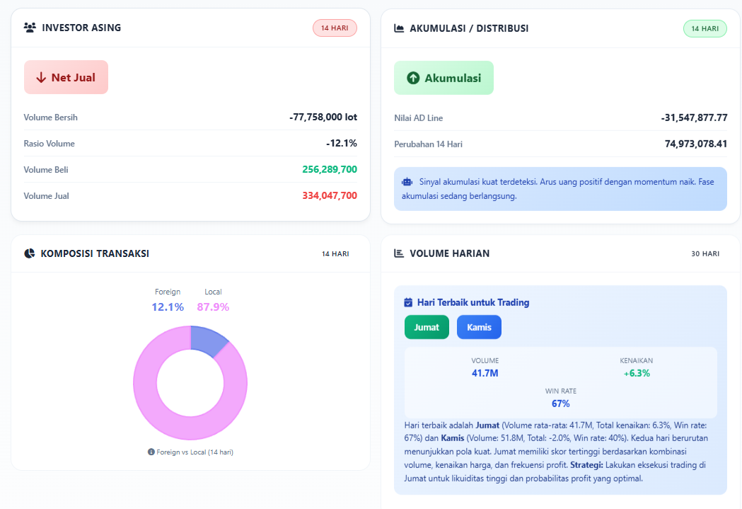 Pantau aktivitas foreign, volume, likuiditas, dan data fundamental dalam bahasa yang mudah dipahami.