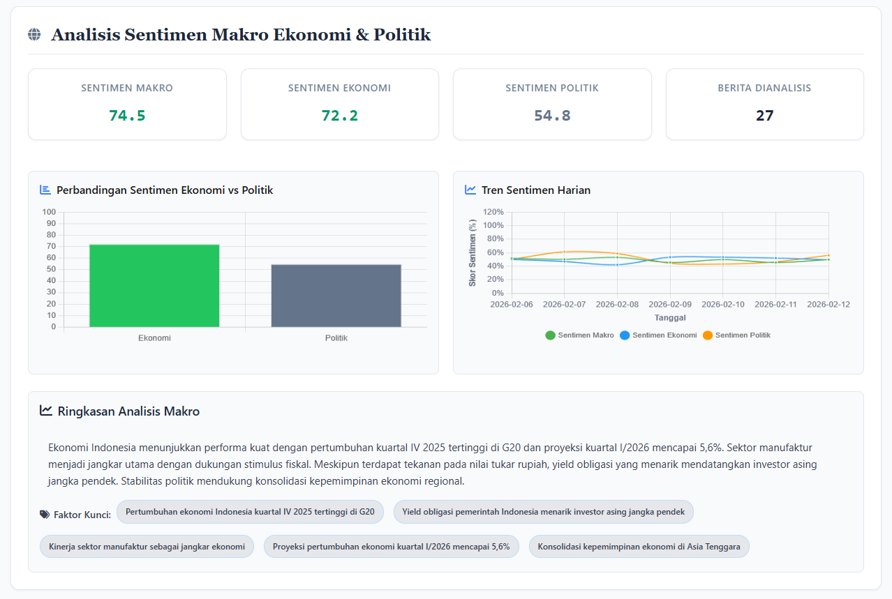 Lihat arah pasar sebelum orang lain baca berita. AI membaca berita Bloomberg dan portal terpercaya, lalu menampilkan skor sentimen dalam grafik yang mudah dipahami.