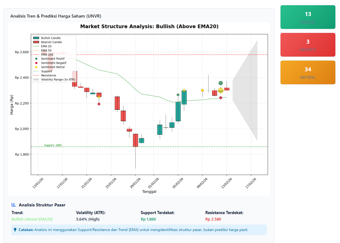 Gabungan analisis sentimen dan market structure dalam satu tampilan. Lihat bagaimana berita mempengaruhi harga secara real-time.