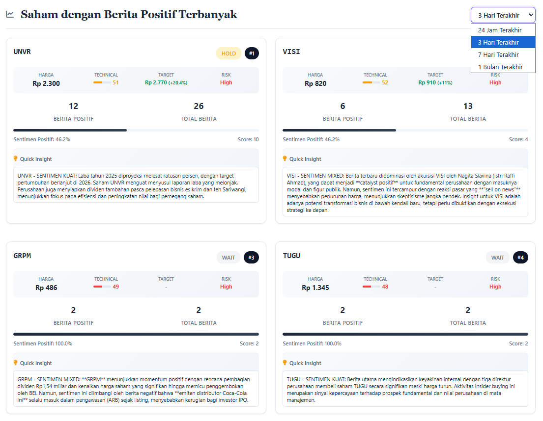 Shortlist saham dengan sentimen positif yang diupdate tiap 3 jam. Dilengkapi skor teknikal, tingkat risiko, target harga, dan sinyal aksi.